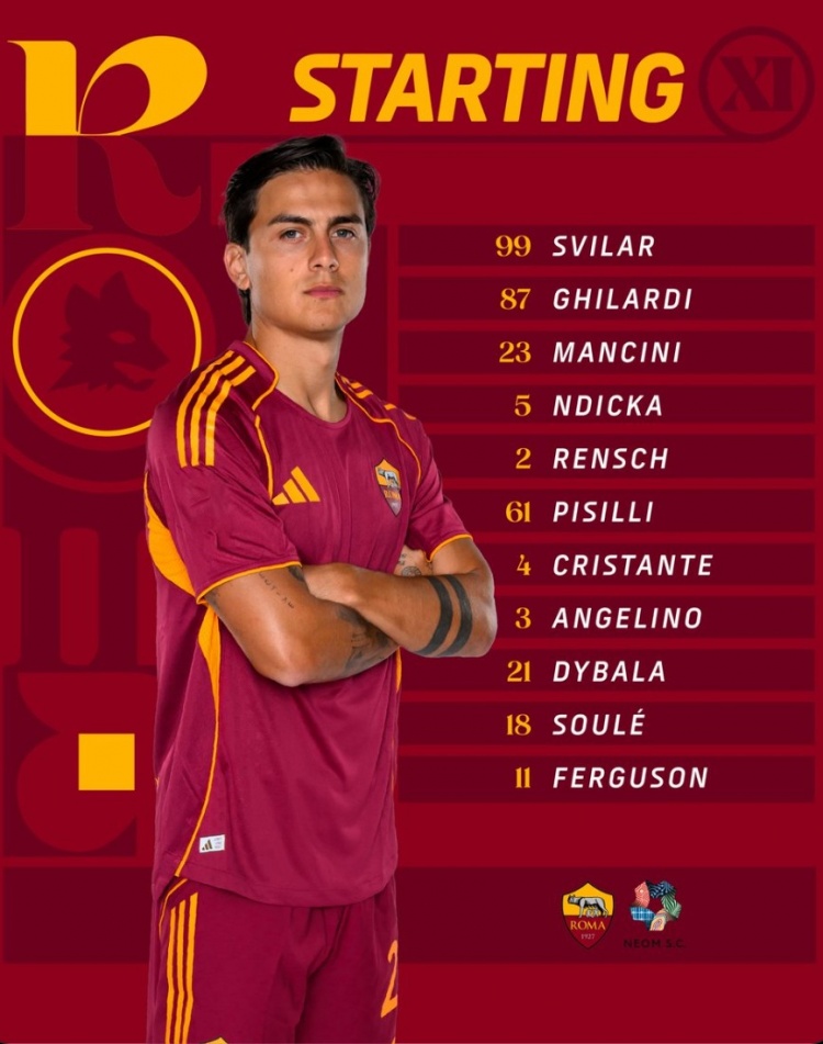 8月16日讯 本周六,罗马将与沙特球队新将来体育进行一场友谊赛,迪巴拉首发出场,苏莱、弗格森、曼奇尼在列。