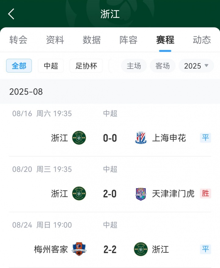 08月24日讯 中超第22轮,津门虎1-1客平海港,浙江2-2客平梅州。