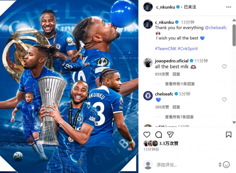 恩昆库社媒写谈:“感谢切尔西俱乐部所作念的一切,为你献上最好意思好的祝贺!”