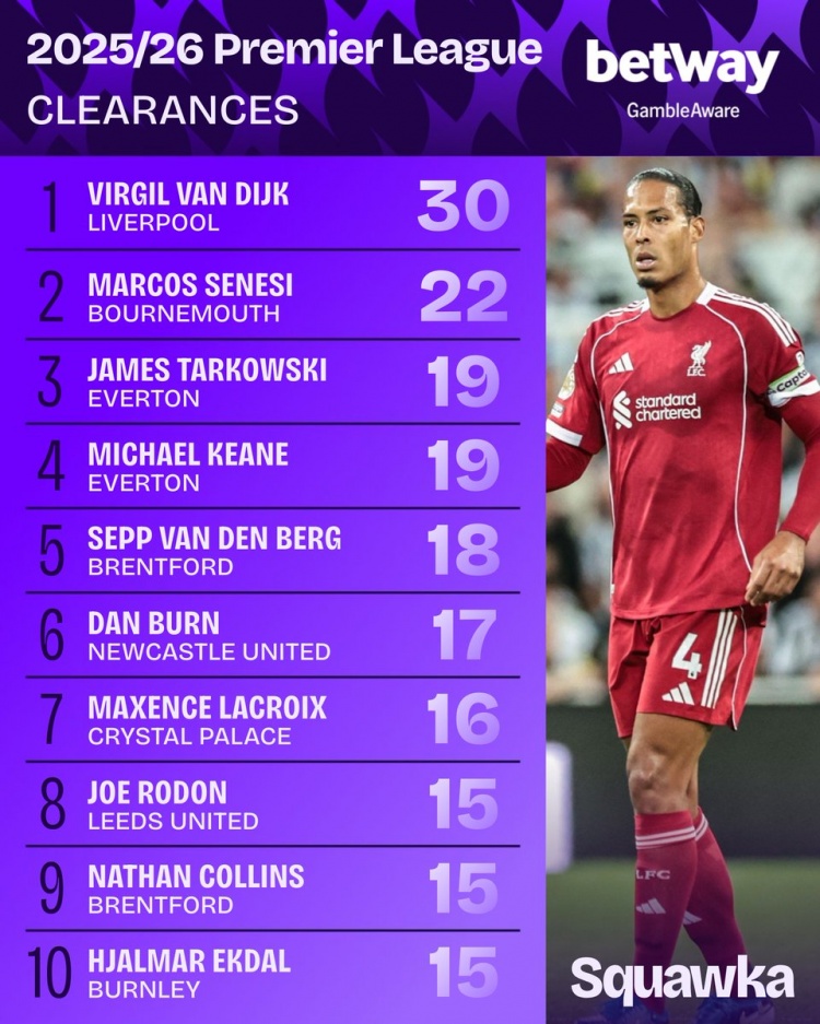 8月28日讯 新赛季英超两轮战罢,据Squawka的数据统计,利物浦中卫范迪克在两场比赛中共有30次突围,在通盘球员中最多。