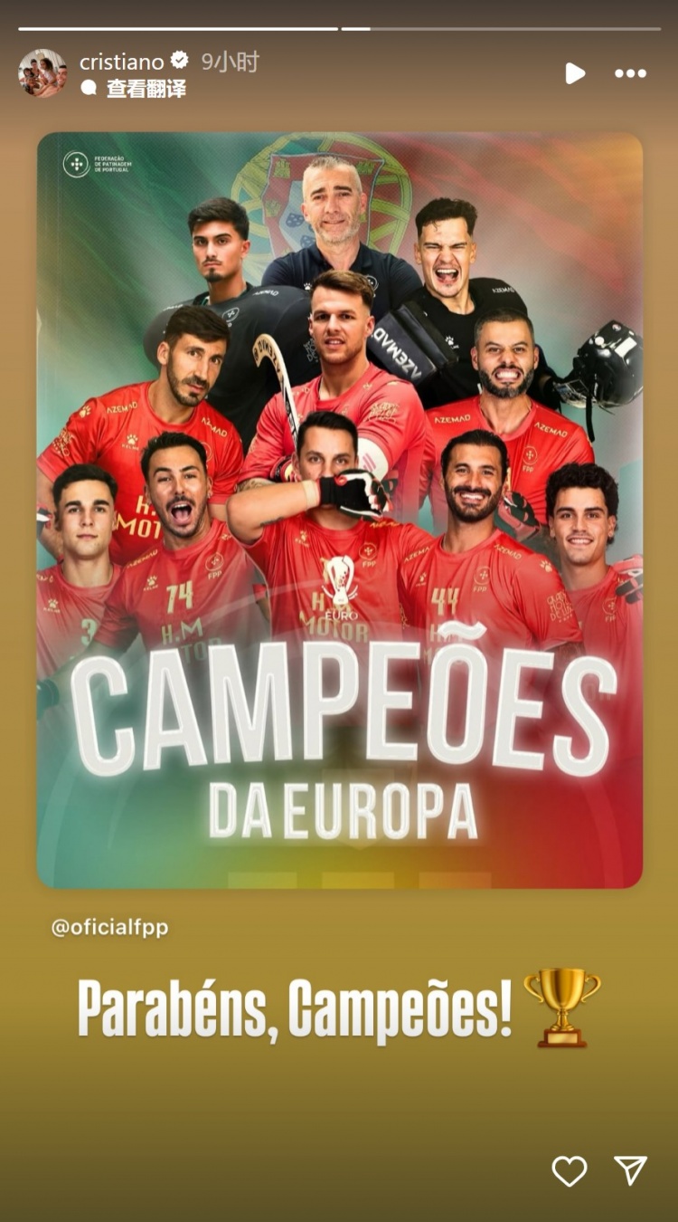 9月8日讯 C罗更新社媒动态,道喜葡萄牙队夺得轮滑曲棍球欧洲冠军。