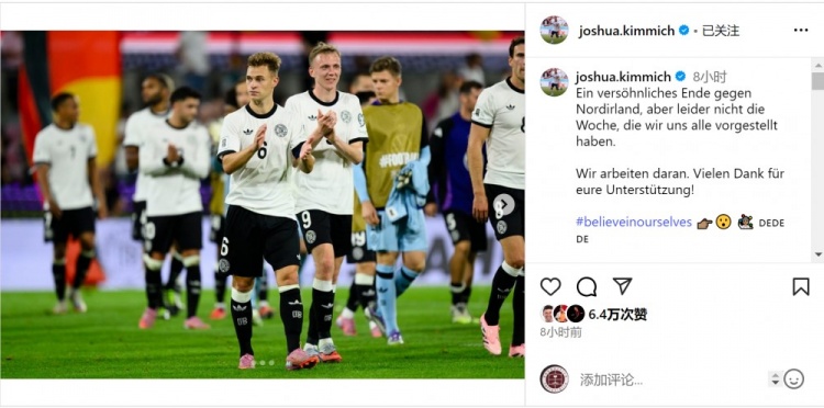 基米希社媒晒出赛后谢场的相片,并写谈:“对阵北爱尔兰的比赛得到了可以的恶果,但缺憾的是,这么的一周并不是咱们统共东谈主期待的。咱们正在奋勉。相配感谢全球的辅助!”