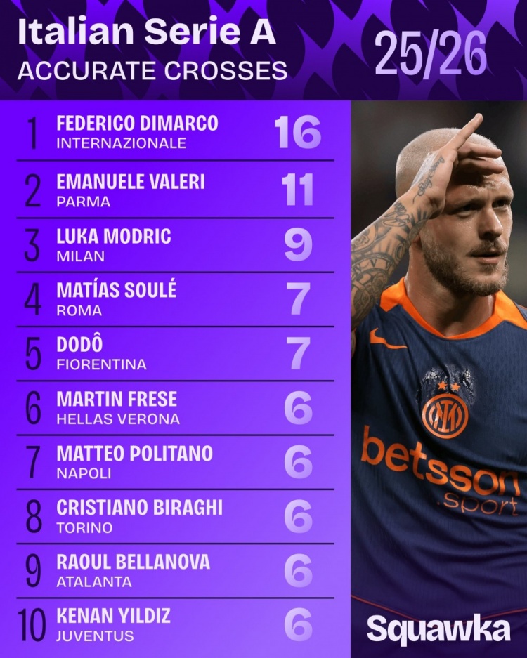 9月26日讯 据Squawka的数据统计,本赛季意甲联赛,国米后卫迪马尔科16次精确传中,名次意甲第一,AC米兰中场莫德里奇9次,名依次三。