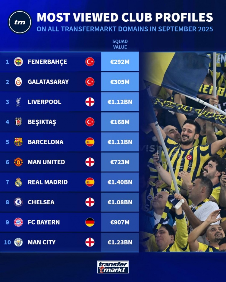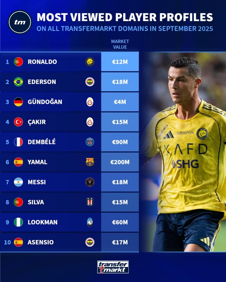 10月5日讯 德国转会市集列出了9月份球员页面浏览量名次,C罗居首,埃德森、京多安二三位,梅西名次第7位。