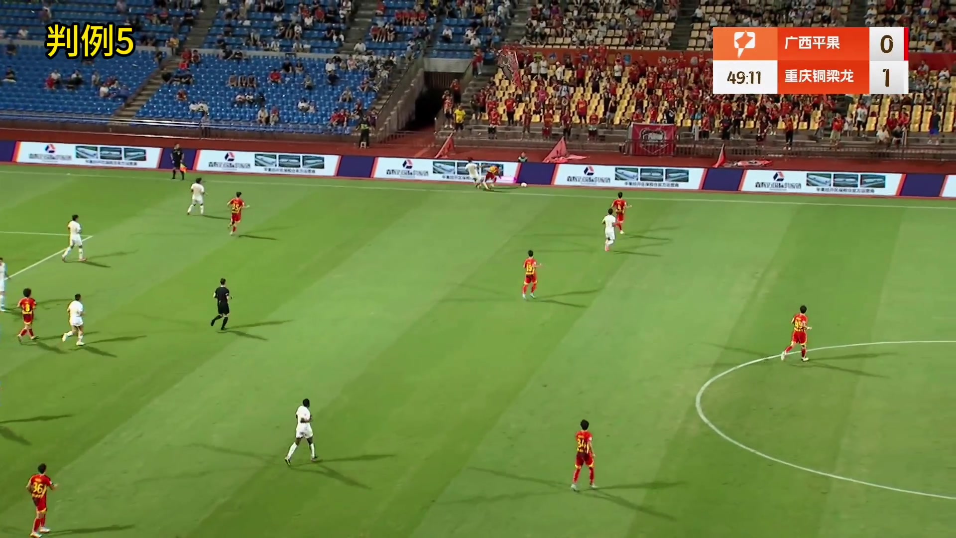 中甲联赛第25轮,广西平果 VS 重庆铜梁龙,比赛第50分钟,重庆铜梁龙16号队员(张志雄)在边线近邻对广西平果10号队员(阿萨莫阿)犯规,后者与场外LED告白展示建筑战役后倒地,后被救护车送往病院。评判员判重庆铜梁龙16号犯规并出示黄牌警告,VAR未介入。