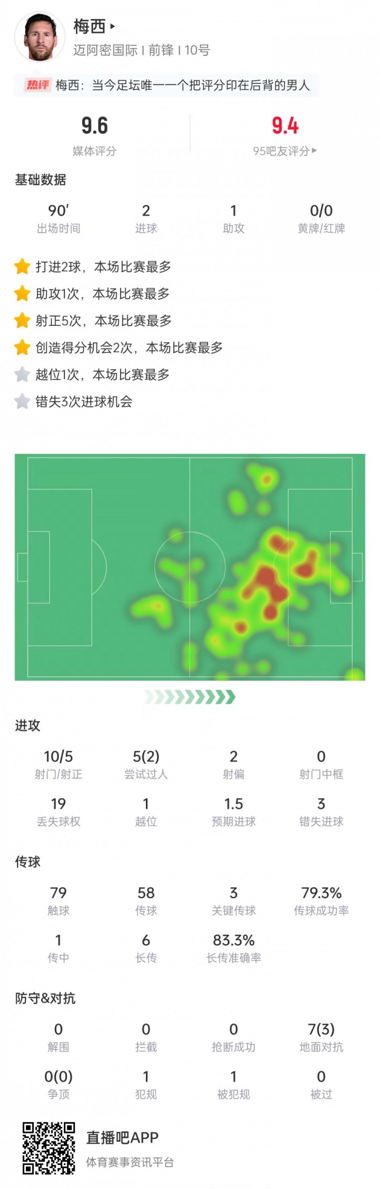 此役梅西踢满全场,2射1传匡助迈阿密外洋取胜,他当选本场比赛最好球员。
