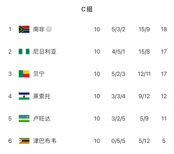 注:非洲预选最终4个收货最佳的小组第2将进行附加赛。因E组惟一五支球队参赛,是以在计较小组第二位排行时,对同组第六名的两场赛事收货不被计较。因此尼日利亚战平津巴布韦的交手记录不被辩论在内。