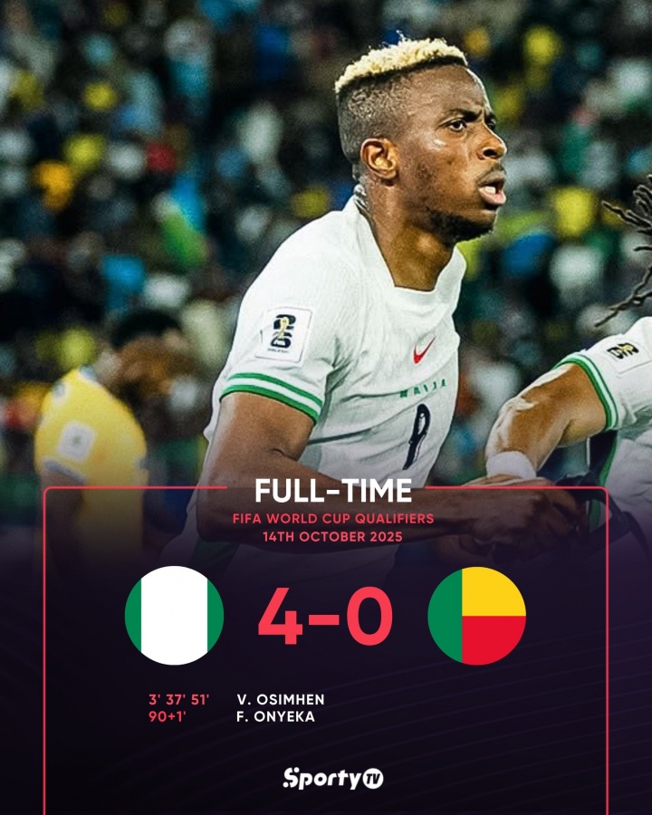 10月15日讯 世初赛非洲区小组赛C组,尼日利亚4-0贝宁,本场比赛奥斯梅恩戴帽,丘库埃泽助攻双响。