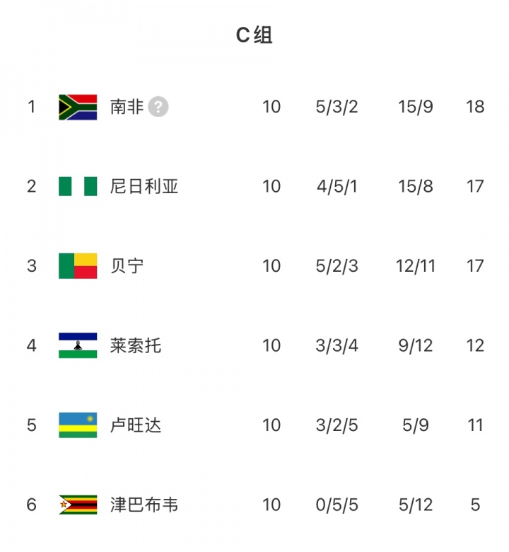 而在这轮之前,贝宁如故C组第别称并杰出南非2分,而终末一轮南非赢得纵贯,尼日利亚名依次二还是详情为四支得益最佳的小组第二,参预附加赛,贝宁则径直无缘寰球杯。