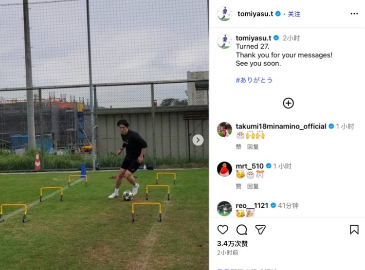 富安健洋写谈:“27岁了。感谢诸君的祝愿!咱们很快就会邂逅。”