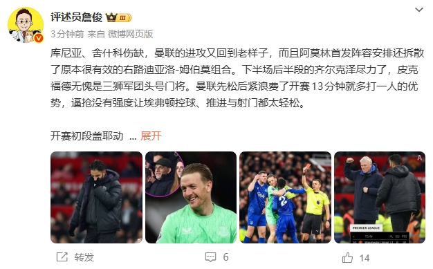11月25日讯 曼联本轮0-1不敌十东谈主埃弗顿,赛后,褒贬员詹俊发文点评。