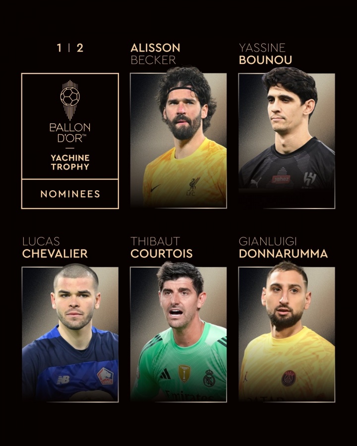 阿利森(巴西/利物浦)、布努(摩洛哥/利雅得新月)、切瓦利耶(法国/里尔)、库尔图瓦(比利时/皇马)、多纳鲁马(意大利/巴黎)