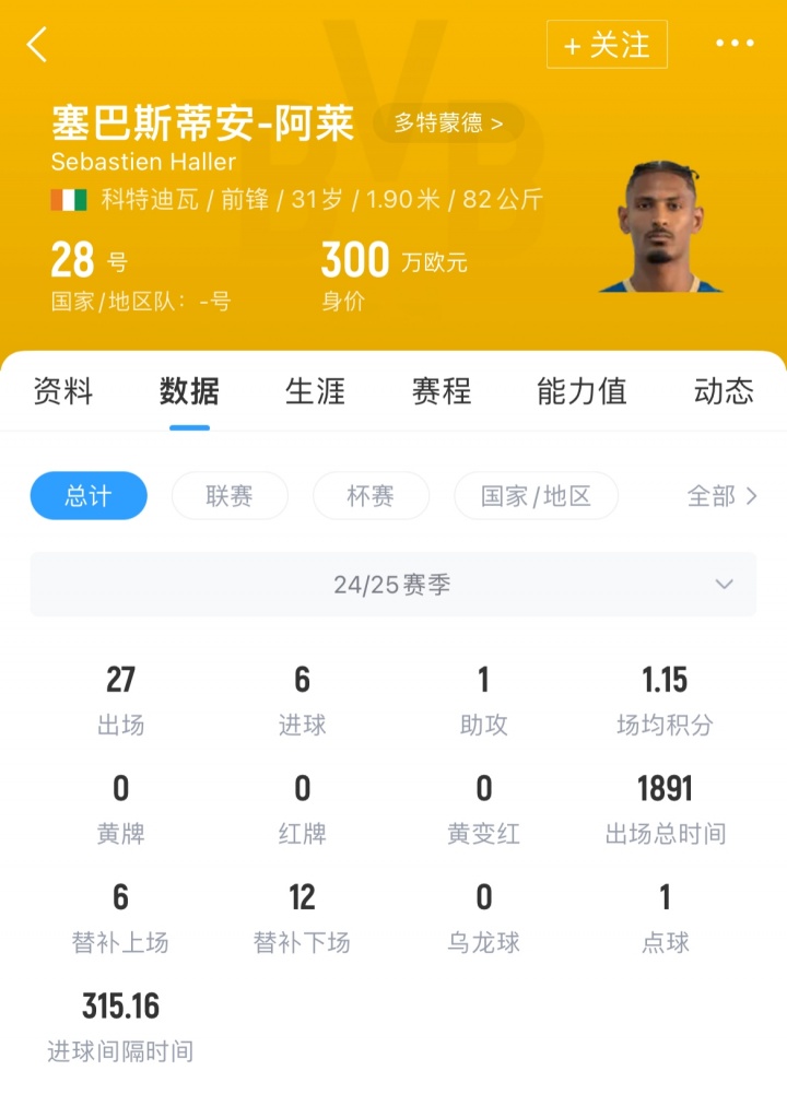 上赛季,阿莱为多特出场27场,取得了6粒进球和1次助攻,目前其德转身价为300万欧。