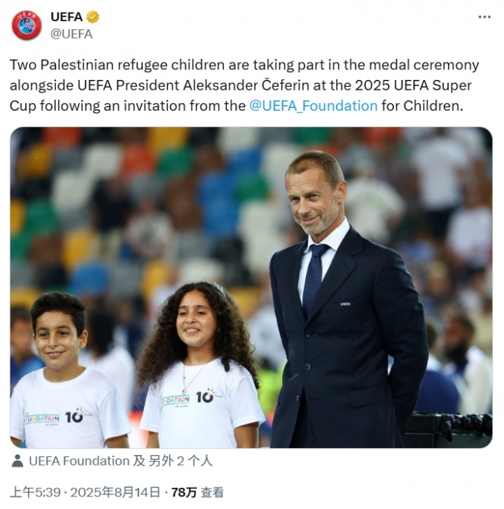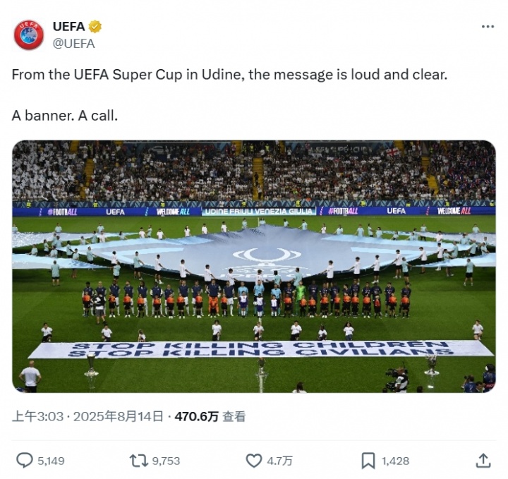 欧足联官方在社交平台上配文写道:“来自乌迪内的欧洲超级杯现场,这则信息响亮且清晰,一面标语,一次号召。”这一标语并没有明确针对的对象,但欧足联在活动期间还邀请了两名来自巴勒斯坦的难民儿童参加颁奖仪式,指向性十分明确。