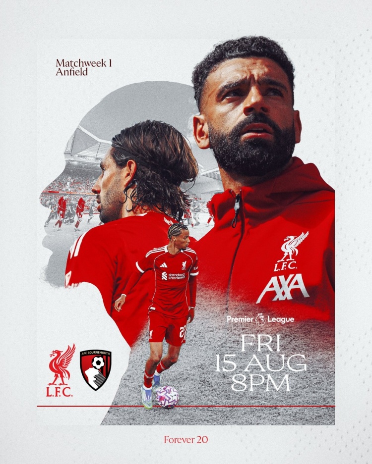 赛前,红军官方晒出海报,为本场比赛预热。萨拉赫领衔多名球员出镜,包括新援埃基蒂克,海报左上角为比赛场地信息,左下角为对阵双方队徽,右下角为开球时间。