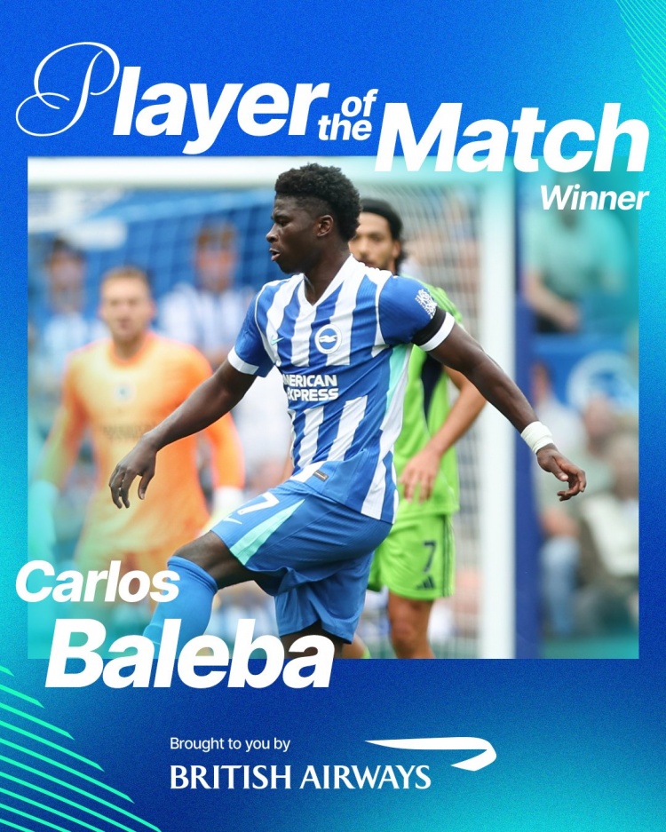8月17日讯 本赛季英超首轮,布莱顿1-1富勒姆。赛后,布莱顿中场巴莱巴当选队内最佳球员。