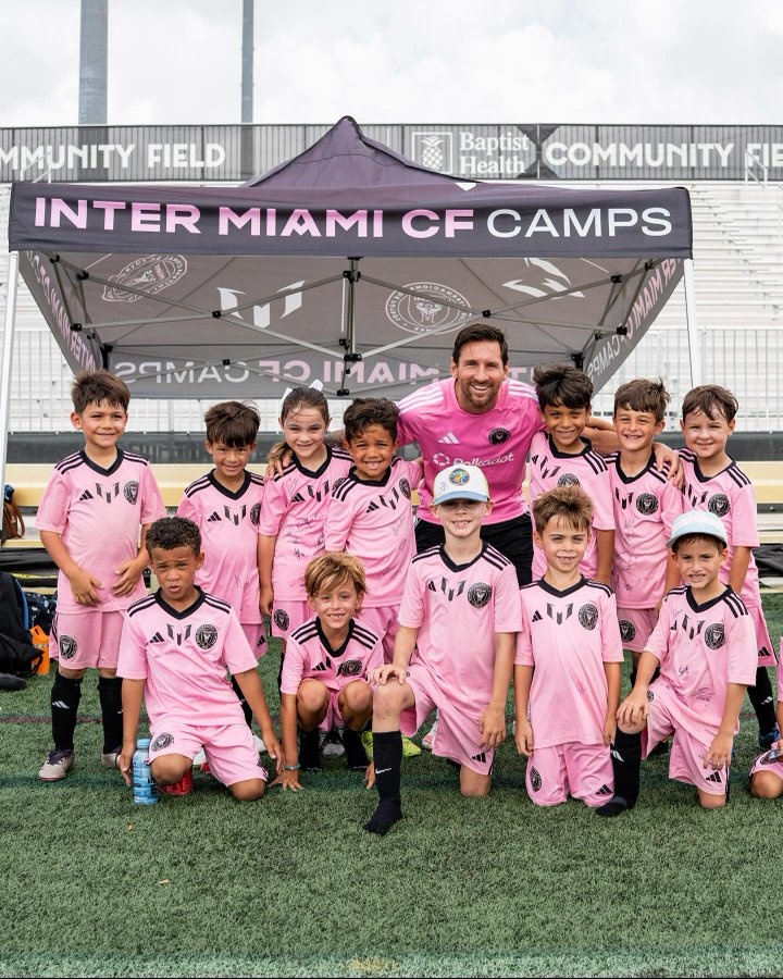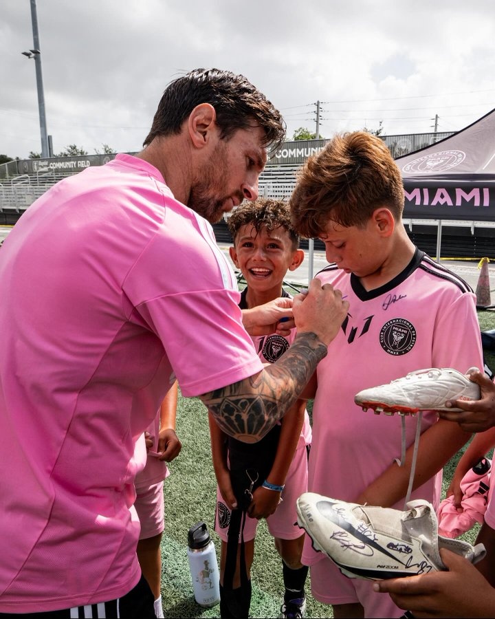 梅西出席迈阿密国际青训学院的活动,与小球员互动,为他们签名并合影。