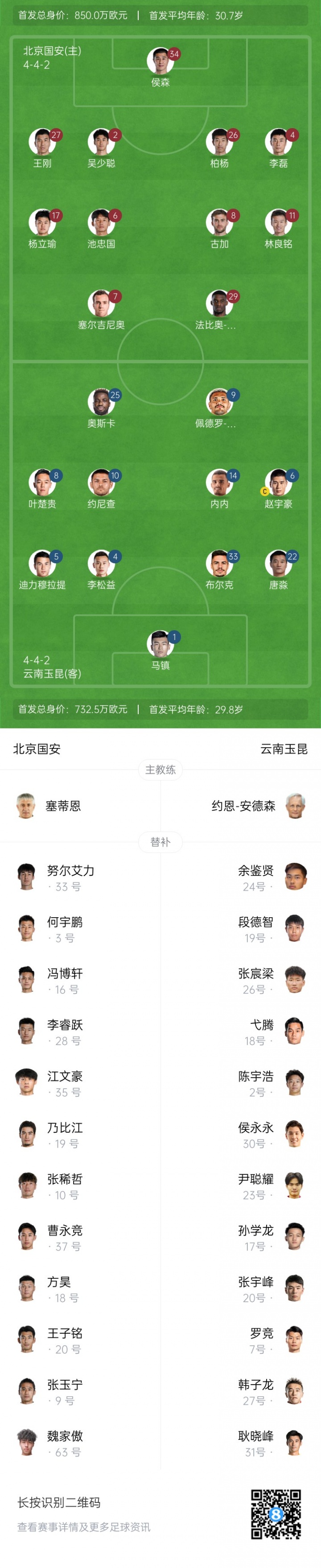 北京国安替补:33-努尔艾力-阿巴斯、3-何宇鹏、16-冯博轩、19-乃比江-莫合买提、28-李睿跃、35-江文豪、10-张稀哲、37-曹永竞、63-魏家傲、9-张玉宁、18-方昊、20-王子铭