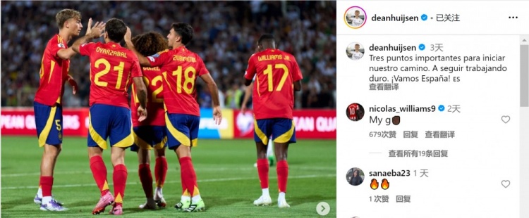 赫伊森社媒晒出比赛照片,配文:“开启世预赛征程的重要三分,让我们继续努力,加油西班牙!”