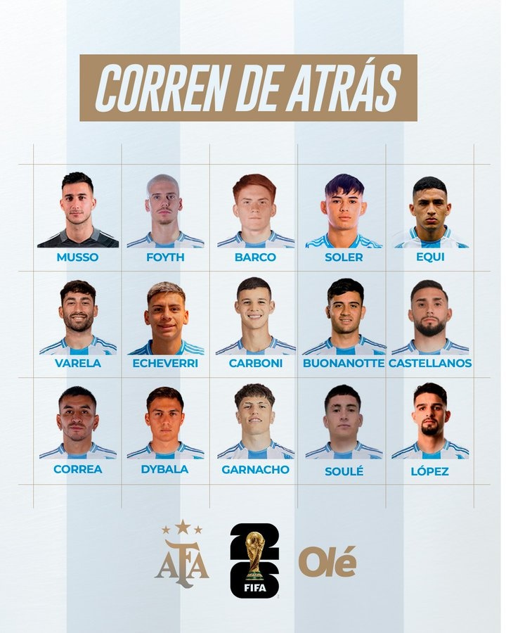 马丁内斯、鲁利、罗梅罗、莫利纳、利桑德罗、奥塔门迪、塔利亚菲科、德保罗、帕雷德斯、恩佐、麦卡利斯特、梅西、阿尔瓦雷斯、劳塔罗、阿尔马达