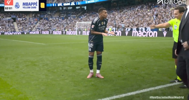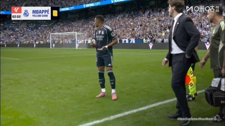 09月13日讯 皇马vs皇家社会比赛第62分钟,姆巴佩倒地接受治疗。治疗结束后,裁判示意他从底线处暂时离场,姆巴佩走至边线处,被裁判出示黄牌。