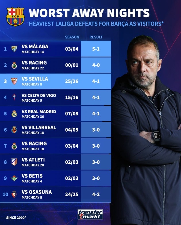 10月7日讯 巴萨本轮联赛客场1-4不敌塞维利亚,德转统计了巴萨本世纪西甲客场输球纪录,他们曾1-5不敌马拉加,3次1-4输球。