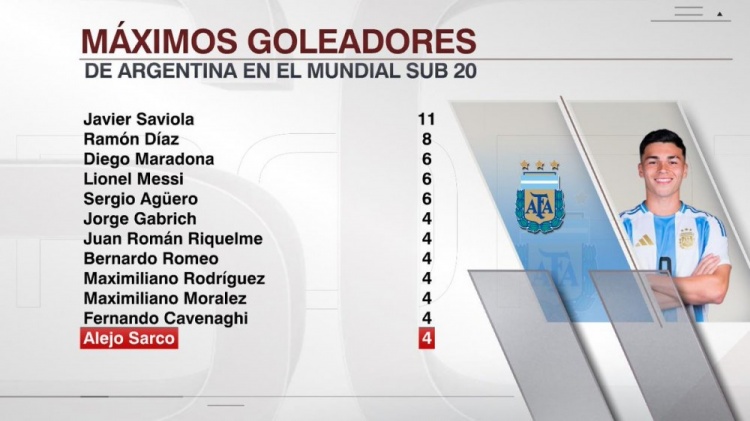 10月9日讯 ESPN统计了阿根廷球员在世青赛历史上的进球数量,并列出世青赛历史阿根廷球员射手榜,萨维奥拉11球断层居首,马拉多纳、梅西、阿圭罗6球,萨尔科本届赛事打进4球上榜。