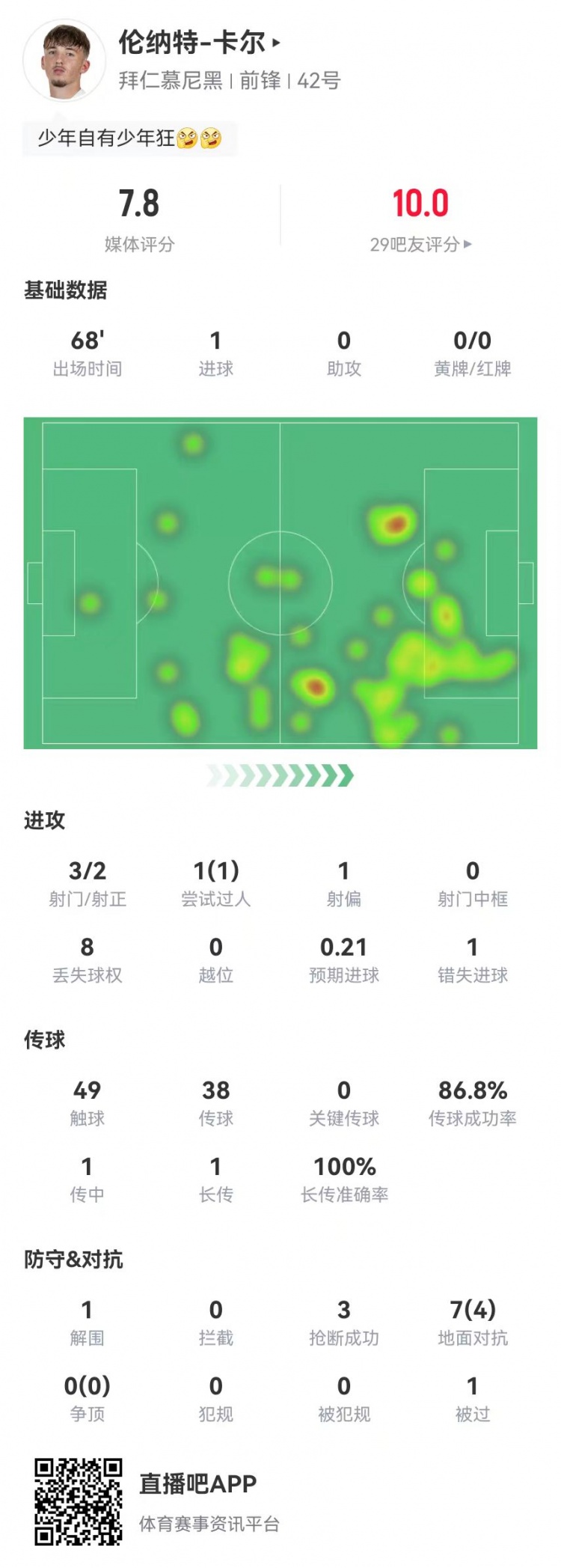 10月23日讯 拜仁在本轮欧冠3-0领先布鲁日,小将伦纳特-卡尔本场数据如下: