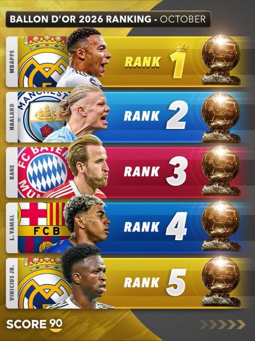 你的位置:欧协联直播 > 西甲 > 👀外媒发布2026年金球奖首期实力排名:姆巴佩居首,亚马尔第四
