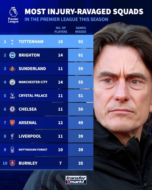 11月25日讯 德转列本赛季英超球队伤病榜,热刺15人次受伤,共计缺席92场比赛排名第一,布莱顿、桑德兰位列二三位。