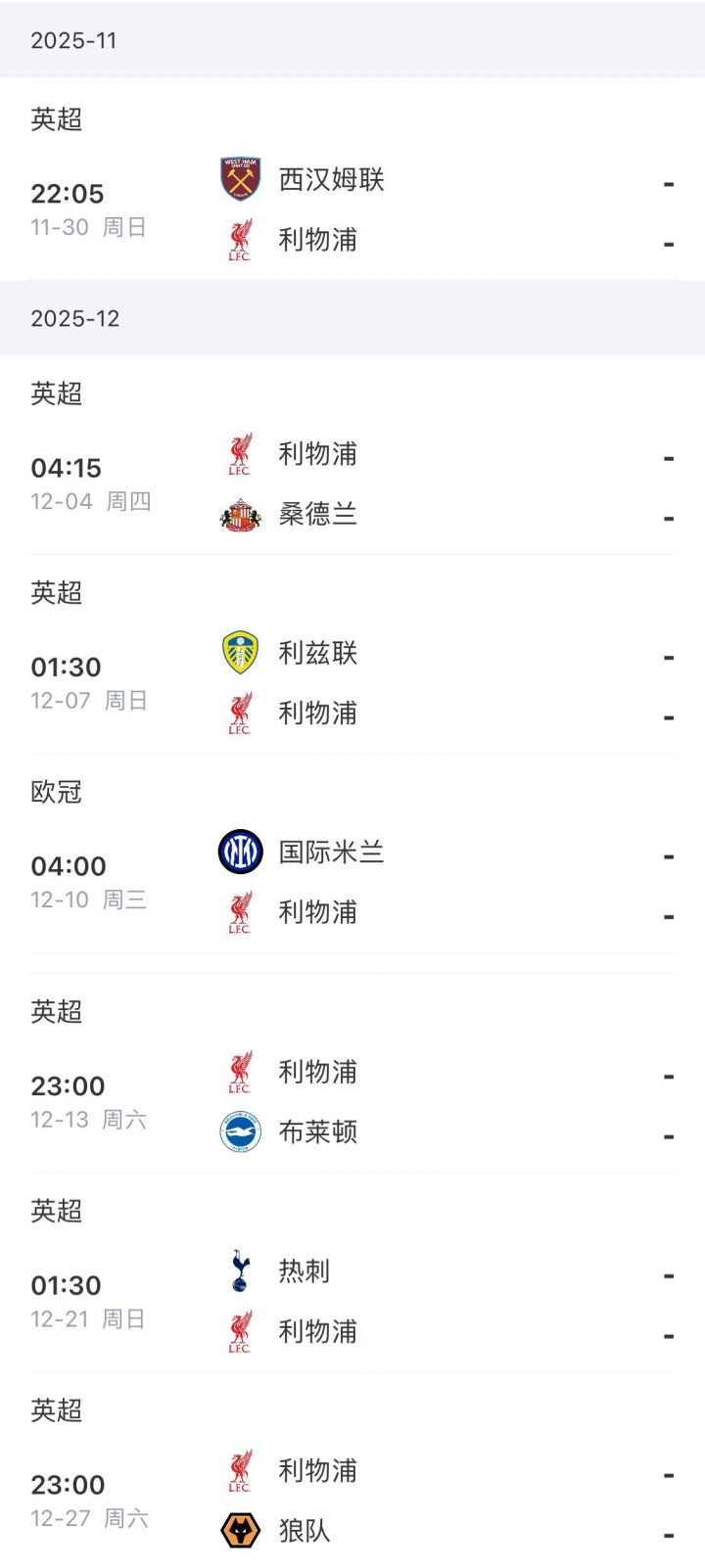 利物浦未来赛程密集,英超将对阵西汉姆、桑德兰、利兹联,欧冠下一轮的对手是国米。