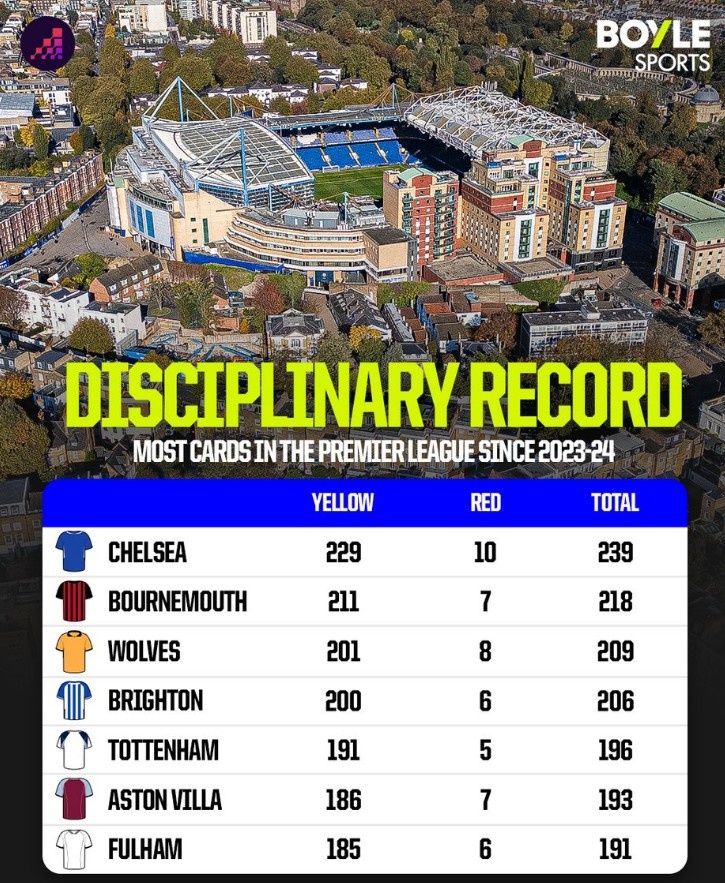 12月1日讯 数据网站OPTA盘点了英超球队自23/24赛季以来吃牌榜,其中切尔西229黄10红,两项数据均为最多,具体榜单如下: