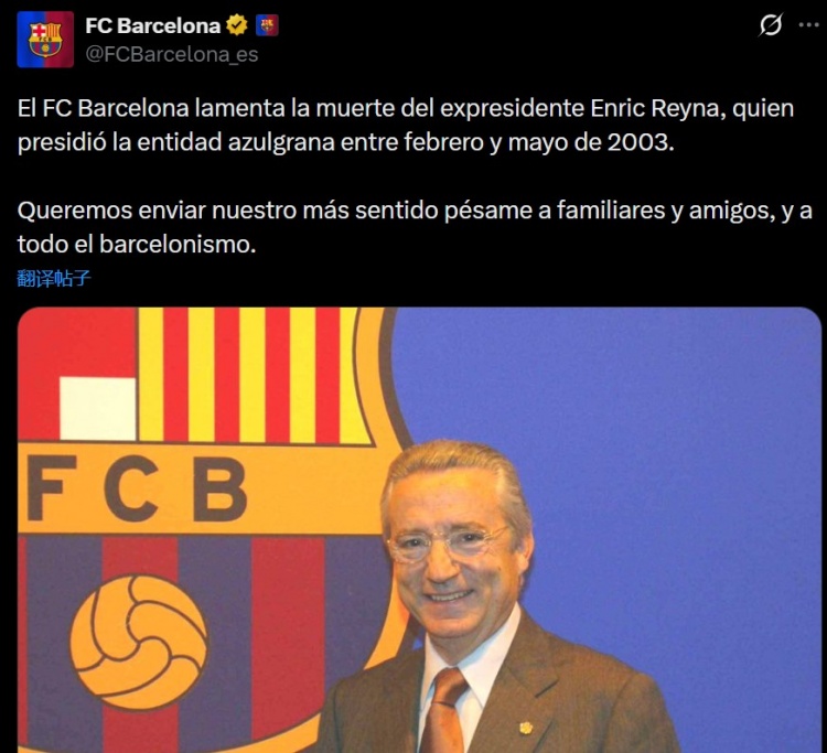 巴萨官方写道:“俱乐部对前任主席恩里克·雷纳的逝世深表哀悼。雷纳曾于2003年2月至5月期间担任俱乐部主席。”