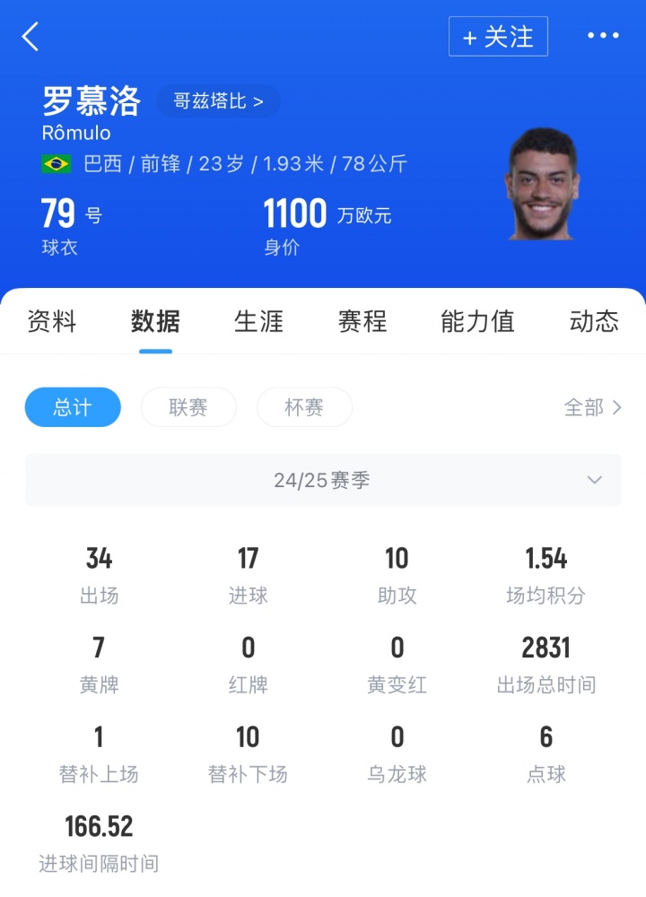 23岁巴西时尚罗慕洛,本赛季代表哥兹塔比出战34场比赛,孝敬17粒进球和10次助攻。当今罗慕洛的身价为1100万欧元。