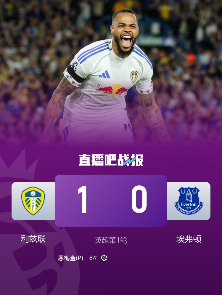 英超第1轮,利兹联在埃兰路球场1-0投诚埃弗顿,利兹联时尚恩梅查在84分钟打进制胜点球。