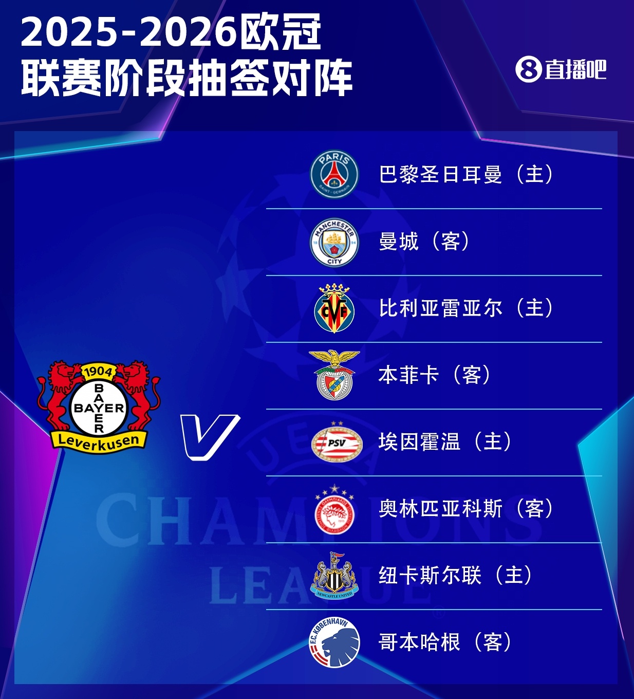 勒沃库森敌手:巴黎圣日耳曼(主)、曼城(客)、比利亚雷亚尔(主)、本菲卡(客)、埃因霍温(主)、奥林匹亚科斯(客)、纽卡斯尔联(主)、哥本哈根(客)