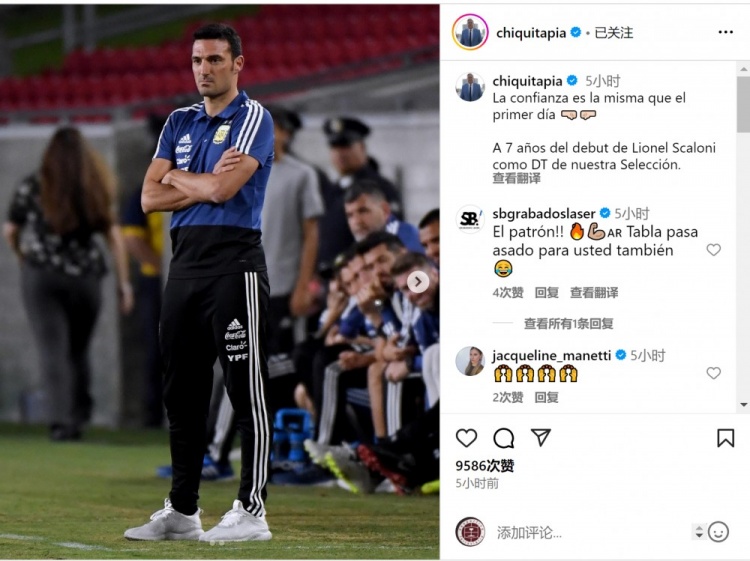 阿根廷足协主席塔皮亚社媒晒出斯卡洛尼的像片,配文:“信心依旧如初🤜🏻🤛🏻斯卡洛尼四肢咱们国度队主帅初度亮相七周年。”