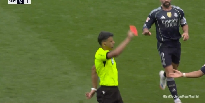 09月13日讯 西甲第4轮,皇家马德里vs皇家社会。上半场比赛中,皇马后卫赫伊森犯规龙套皇家社会反击,被主裁曼萨诺直红罚下,而这也不是曼萨诺与皇马之间的第一次故事。