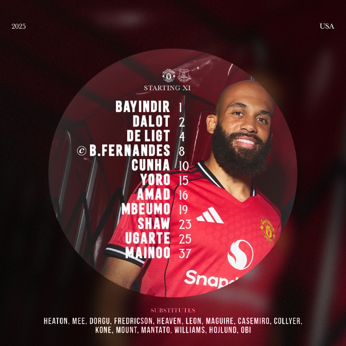 曼联首发:1-巴因迪尔、2-达洛特、4-德里赫特、23-卢克-肖、15-约罗、25-乌加特、8-B费、10-库尼亚、37-梅努、16-阿玛德、19-姆贝莫