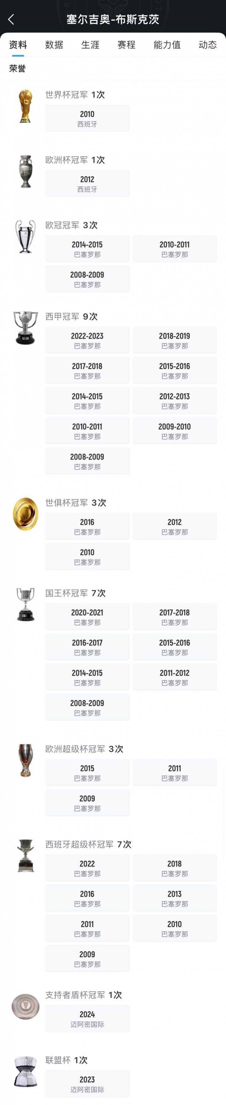 布斯克茨出说念于巴萨青训,2023年离开巴萨,18年红蓝糊口为巴萨出战722场比赛,孝顺18球和46次助攻,匡助球队夺得了3次欧冠冠军、3次世俱杯冠军、9次西甲冠军、3次欧洲超等杯冠军、7次国王杯冠军、7次西班牙超等杯冠军。