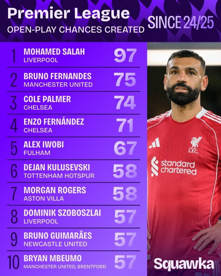 10月16日讯 日前,Squawka统计了英超绽开战创造契机次数名次,萨拉赫居首,B费、帕尔默分居二三位。