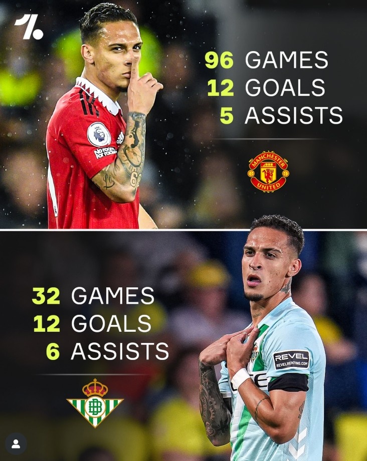 据统计,安东尼在贝蒂斯生活32场各项赛事孝顺12球6助攻,径直参与18球,而其在曼联生活96场比赛打进12球助攻5次,径直参与17球。