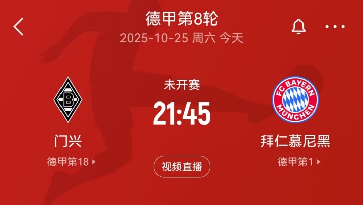 10月25日讯 官方音尘,拜仁vs门兴比赛推迟至北京时代21:45开球。