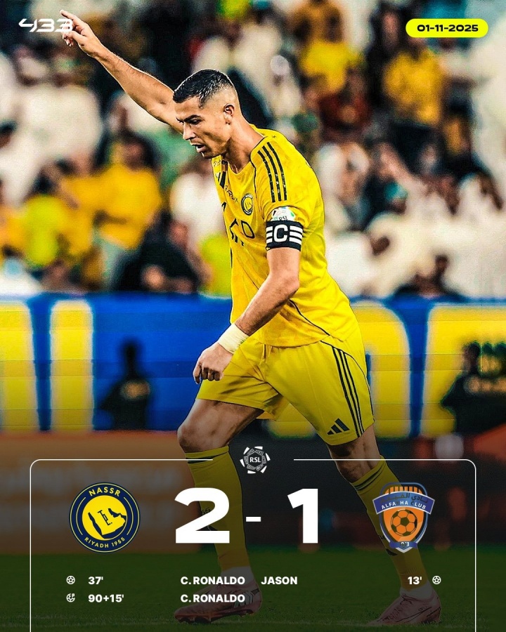 11月1日晚上的沙特联第7轮,利雅得奏效主场2-1逆转费哈,C罗双响+第104分钟点射绝杀。
