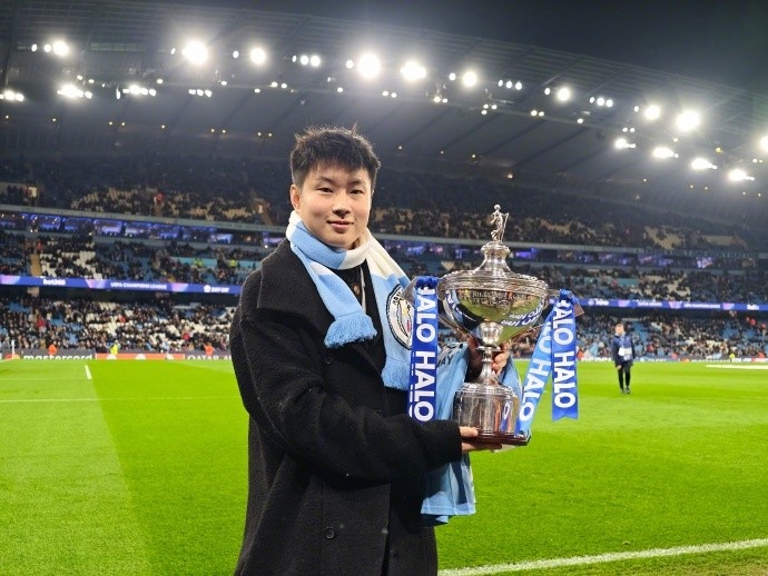 北京工夫11月26日凌晨4时,欧冠联赛阶段第5轮,曼城主场不敌勒沃库森。本场比赛,新科斯诺克世锦赛冠军赵心童现场不雅赛,他向全场球迷展示了世锦赛冠军奖杯,何况还获赠一件印有他名字的曼城147号球衣。