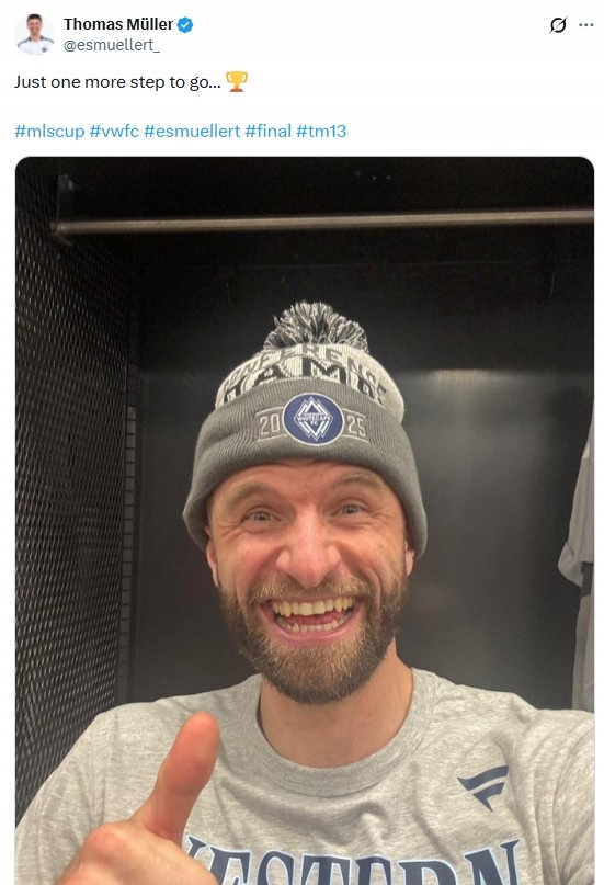 在本场比赛后,穆勒更新社媒并晒图:咱们离好意思职联总冠军仅一步之遥!