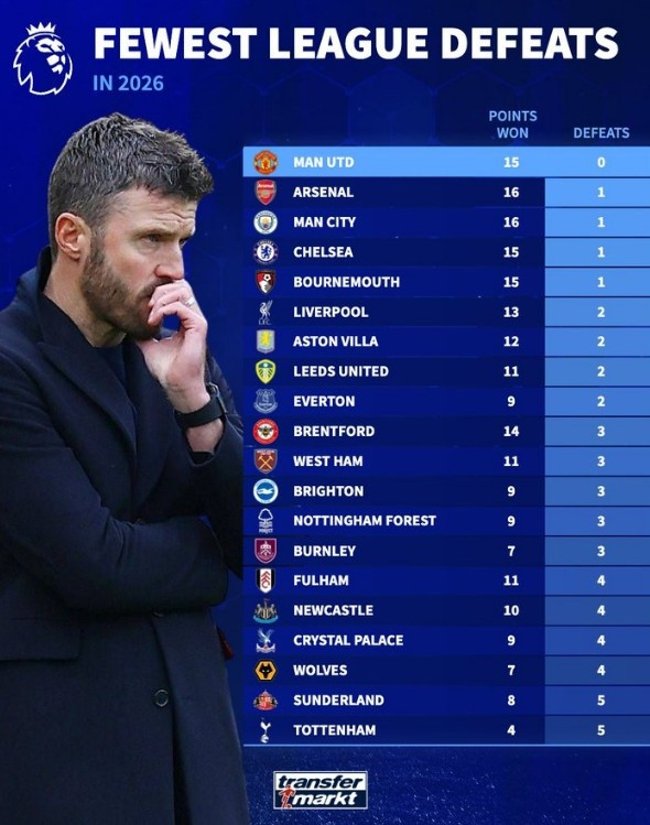 直播吧2月23日讯德转盘点了在2026年英超失败 场次最少球队榜单,其中曼联是唯一还未尝败绩的球队,以下为具体情况(2026年积分+失败 场次):