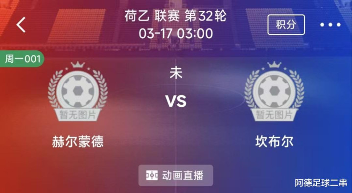 001荷乙:海尔蒙特VS坎布尔 时间:2026-03-17 3:00 场地:拉文斯运动场