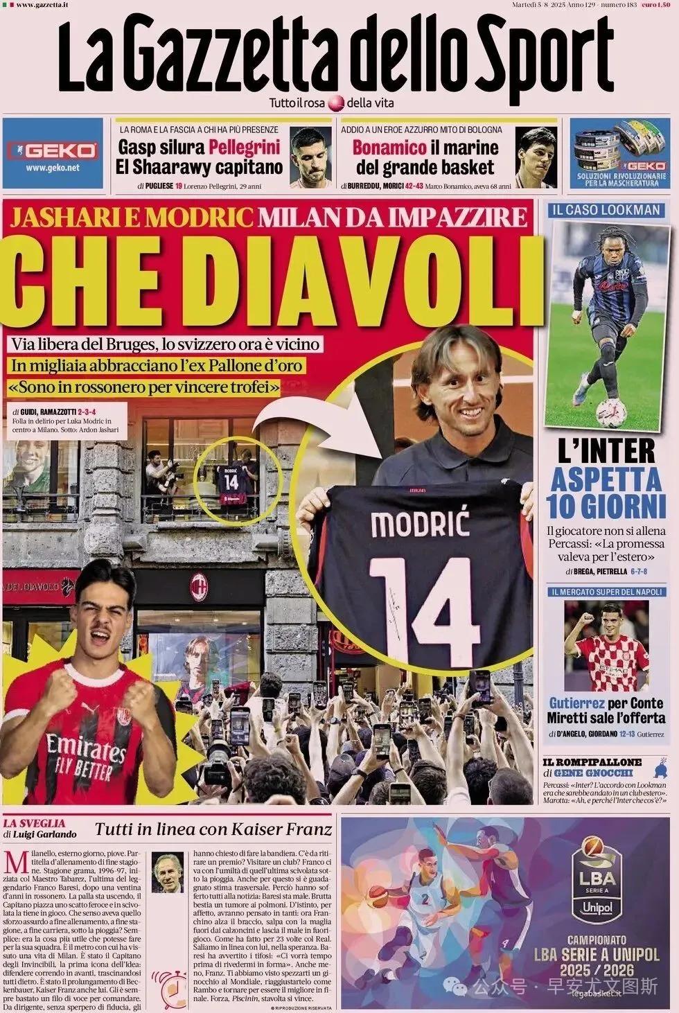 1、奈何的妖魔。贾沙里和莫德里奇,米兰为之放纵。离开布鲁日,瑞士东谈主当前接近了。数千东谈主拥抱这位前金球奖得主。“我来红黑军团是为了获得奖杯的。”