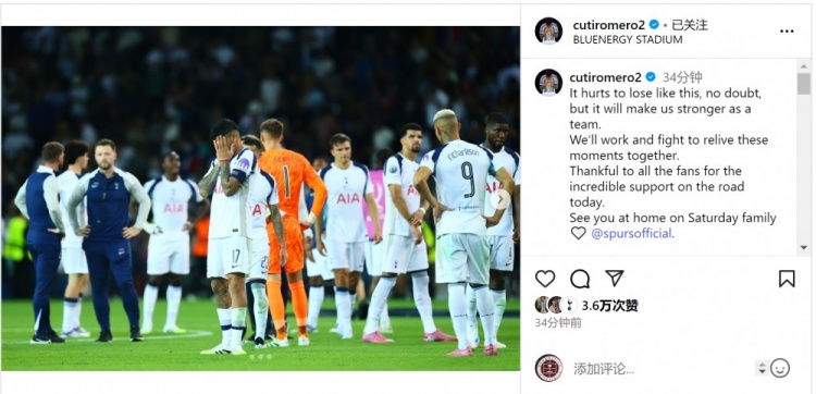 热刺队长罗梅罗社媒晒出赛后失意的像片,配文:“毫无疑问,以这么的表情输球令东谈主灾难,但这会让咱们当作一支球队变得更弘远。咱们会勉力拼搏,沿路重现争冠时期。